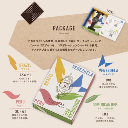 「明治 THE Chocolate」のカカオが育ったそれぞれの国へひと口で旅立たせてくれるように、「KAORU」は普段の生活に、ふとした瞬間、異国の風を感じリフレッシュ出来るファッションウォッチです。