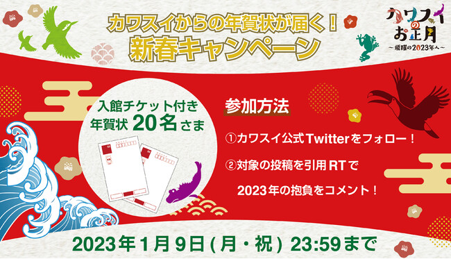 実施内容:カワスイのお正月キャンペーンとして、カワスイ公式Twitter(@kawasui_aqua)をフォローの上、該当の投稿を引用リツイートで2023年の抱負をコメントしてください。抽選でカワスイ入館チケットつき年賀状が当たります。