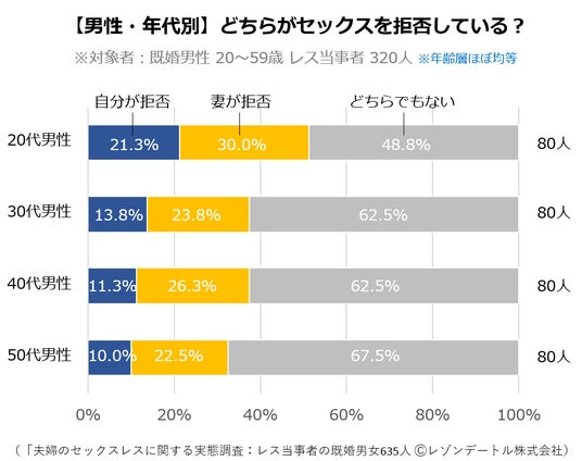 「どちらでもない」が最も多く、次に「妻が拒否」で、「自分(夫)が拒否」は最も少ないという構造は変わりませんが、20代で「自分(夫)が拒否」の割合が2割に上るのが注目されます。