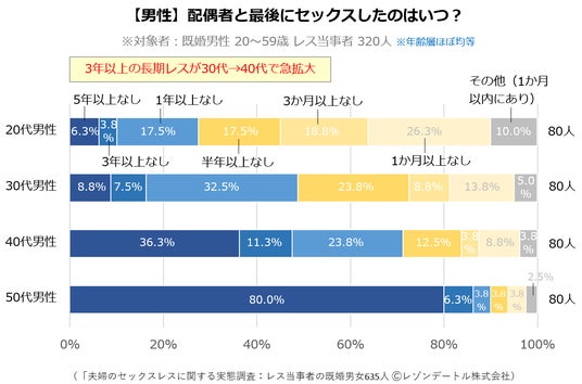20代→30代→40代→50代と年齢層が上がるにつれて1年以上の長期レスの割合(青帯全体)が27.6%→48.8%→71.4%→90.1%と、約20%ずつ上昇していくのは興味深いところです。半年以上なし~その他の層が20%ずつ長期レスに加わっていくというイメージになるでしょうか。