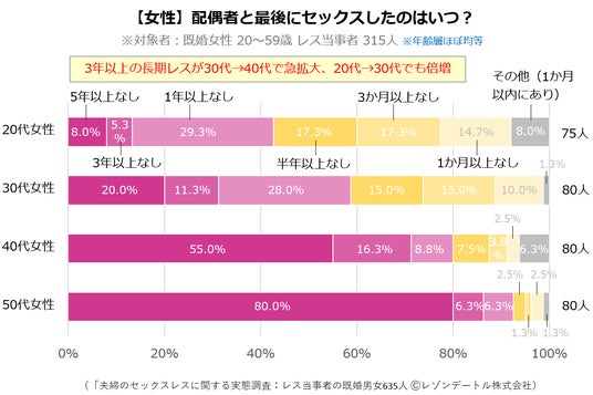20代→30代→40代→50代と年齢層が上がるにつれて1年以上の長期レスの割合(ピンク帯全体)が42.6%→59.3%→80.1%→92.6%と、男性と同様に漸増していきます。20代~40代は男性よりも長期レスの割合が10%高くなっているのが興味深いところです。