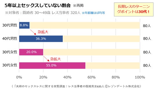 今回の調査では、レス当事者の多くが1年以上レスの続く「長期レス」であることが分かりました。長期レスは30代で過半数となり、40代になるとそのうち「5年以上のレス」が急拡大します。レス解消には30代がターニングポイントになりそうです。