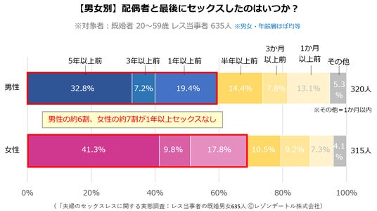 「完全レス」の人の64.1%が配偶者と1年以上セックスしておらず、うち37.0%は5年以上していないことが分かりました。長期間のレス(長期レス)が大半を占めるという結果です。続いて、男女別にみると次の結果になりました。