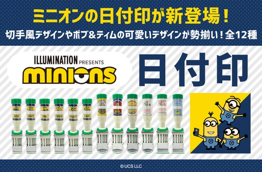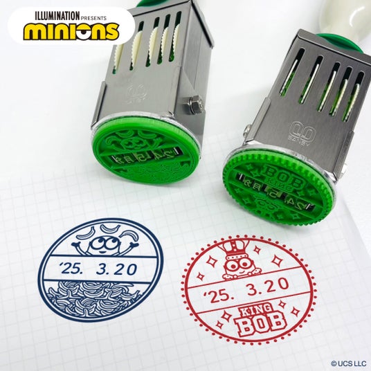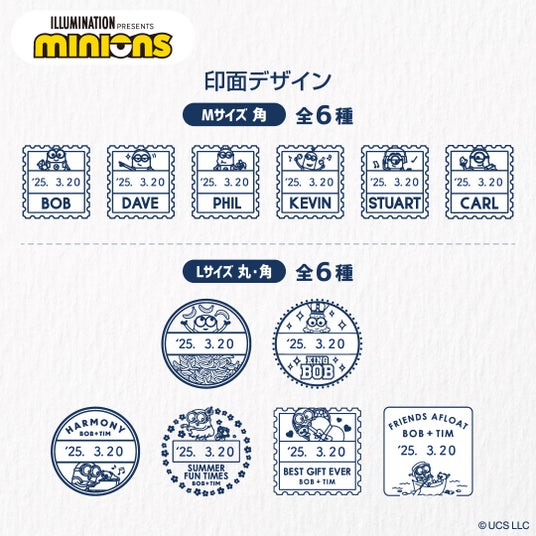 日付部分を自由に変えたり、日付を入れずにスタンプを押すことが出来て、メッセージなどが書けるミニオン日付印も好評発売中!切手風デザインやボブ&ティムの可愛いデザインが勢揃い♪