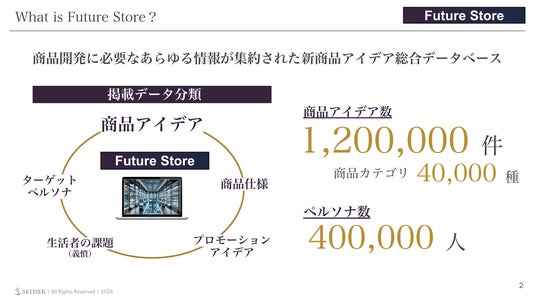 「FutureStore」は、過去10年分のヒット商品を分析することで抽出した1,200種類のアイデア発想パターンと、SEEDERが蓄積してきた商品開発ナレッジをもとに120万件の商品アイデアを収録したデータベースです。