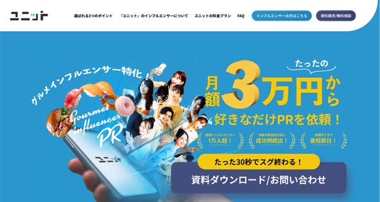 「ユニット」は、UNITが展開するインフルエンサーPR事業です。「お店のことが好きな人でお店をいっぱいにすること」を使命に、グルメフード業界に特化したインフルエンサーPRを通じて、飲食店・フードブランドの集客支援を行っています。「ユニット」のサービスは、大きく以下の2つで構成されています。