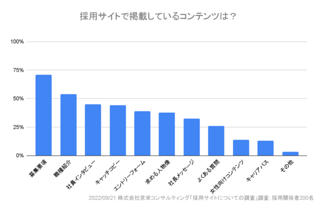 弊社が行った「採用サイトについての調査」によると、「お勤めの企業の採用サイトで掲載しているコンテンツは?」に対する回答として、「募集要項(70.97%)」「職種紹介(53.76%)」「社員インタビュー(45.16%)」「キャッチコピー(44.09%)」が多く上がりました。