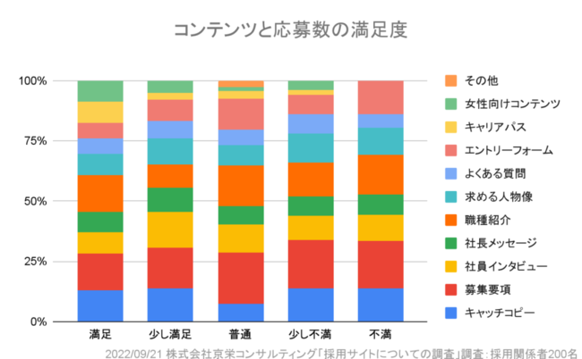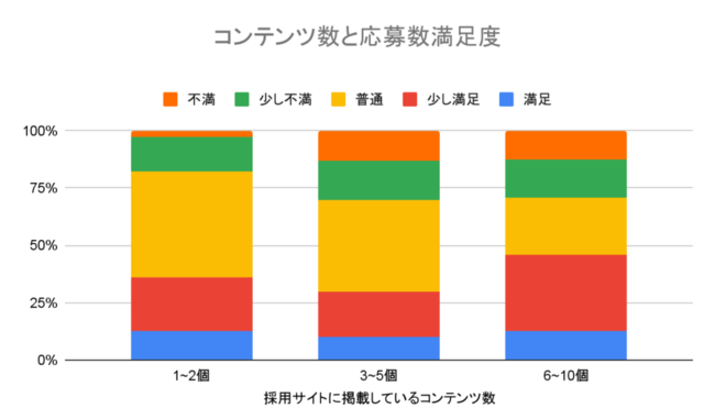 調査の時点ではコンテンツと応募数の満足度についてはコンテンツがあれば必ず満足度が上がるわけではないという結果でした。「何を掲載するか?」よりも「掲載したコンテンツの質」や「効果的な集客・運用」が大切そうです。