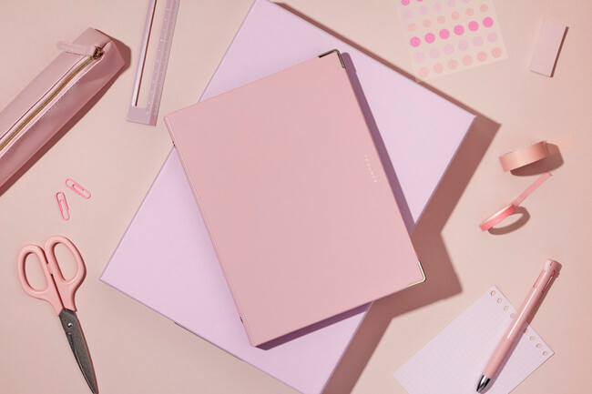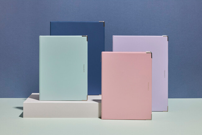 表紙は、360°折り返して使えるので、限られたデスクスペースで使用することができます。また、持ち運んで使用する際にも、軽くかさばらないよう、スリムな設計にしています。