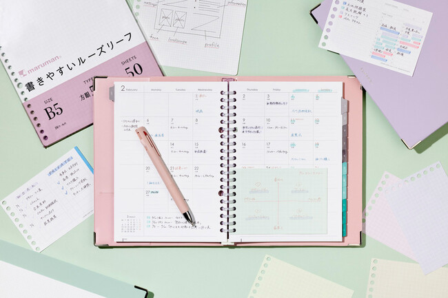 別売りのルーズリーフダイアリーと組み合わせれば、手帳としても活躍します。ルーズリーフバインダーは、カスタマイズできるので、ユーザーの好みに合わせた使い方ができます。必要なページのみを挟んで荷物を軽くしたい人や、手帳とノートを1冊で管理したい人におすすめです。