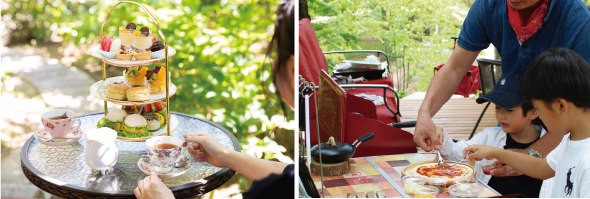 木々に囲まれたピクニックエリアやテラス席で美味しい食事やデザートと共に紡ぐ、ゆったりとしたアフタヌーンティーで贅沢な時間を過ごしたり、手作りピザ体験を楽しむことができます。