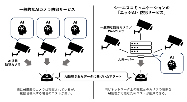 今回の「エッジAI・防犯サービス」はエッジAI技術とシーエスコミュニケーションが得意とするネットワーク構築の技術を組み合わせています。