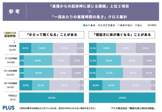 起床時に感じる課題上位2つ「かえって眠くなる」「寝起きに体が痛くなる」について、昼寝時間の長さとの関連を調べるためクロス集計を行いました。時間別で比較したとき特段大きな差は見受けられませんでしたが、「かえって眠くなる」について「5~15分程度」「15~30分程度」では「よくある」と回答した人が他と比べ少なく、「30~45分程度」を越えると両項目で「よくある」の回答者が20%を超えるといった特徴が見られました。