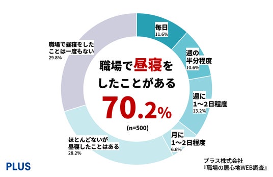 プラス株式会社ファニチャーカンパニー(東京都渋谷区)は、『職場の居心地WEB調査』と題し、従業員数100名以上のオフィスで働く会社員(フルリモートワークを除く)500名を対象に、職場での『昼寝』についてのWEB調査を実施いたしました。その調査結果を発表いたします。