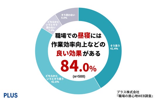 アンケートの結果から、84%の人が「職場で『昼寝』をすると、作業効率の向上などの良い効果が得られる」と考えていることがわかりました。