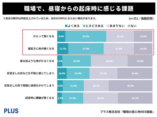 最後に、職場で昼寝したことがあると回答した351名に対し、昼寝からの起床時に感じる課題について尋ねたところ、「かえって眠くなる」が51.6%で最も多く、次に「寝起きに体が痛くなる」が48.7%で続きました。