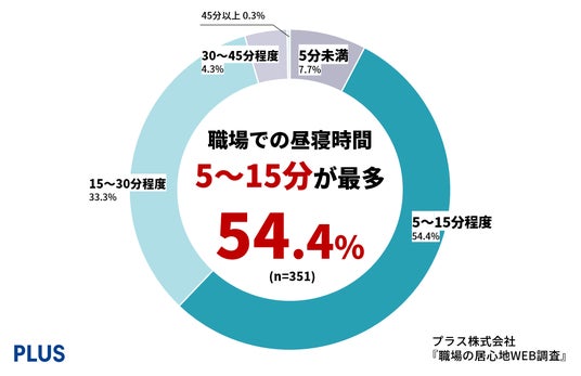 次に、職場で昼寝したことがあると回答した351名に対し「一回あたりの昼寝時間の長さ」を尋ねたところ、「5分未満」が7.7%、「5~15分程度」が54.4%、「15~30分程度」が33.3%、「30~45分程度」が4.3%、「45分以上」が0.3%となりました。