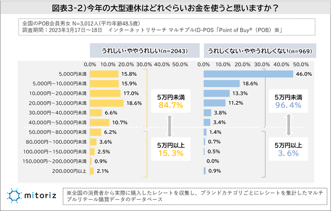 また大型連休を「うれしい・ややうれしい」と捉えている人は5万円以上の予算を想定している割合が15.3%でしたが、「うれしくない・ややうれしくない」と捉えている人は3.6%となり、連休を楽しみにしている人ほど予算が高い傾向が出ています(図表3-2)。