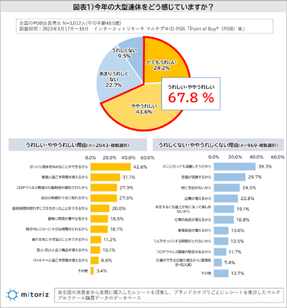 約7割は大型連休を「うれしい」と感じており、理由は「ゆっくり身体を休められる」が42.6%でトップ
