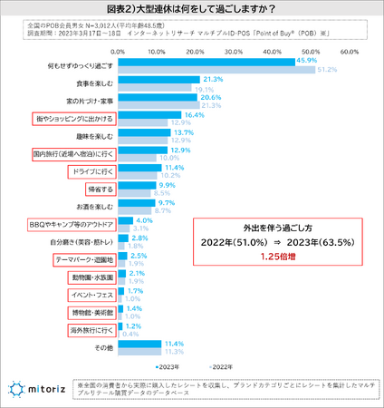 2022年と比較すると「何もせずゆっくり過ごす」「家の片づけ・家事」はどちらも減少しており、外出を伴う過ごし方、全体では2022年が51.0%に対して、2023年は63.5%となっており、1.25倍増という結果となりました。昨年よりもアクティブな過ごし方をする人が増えている傾向がありそうです(図表2)。