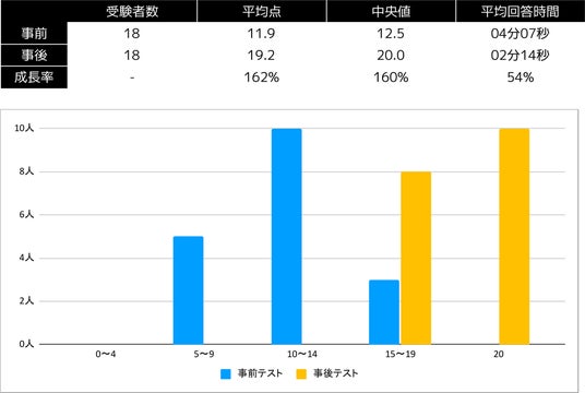 *18名の学生を対象に、Monoxer学習の前後でテストを実施しました。学習後は、学習前と比較して平均回答時間が約2分の1に短縮され、平均点は1.6倍に向上しました。