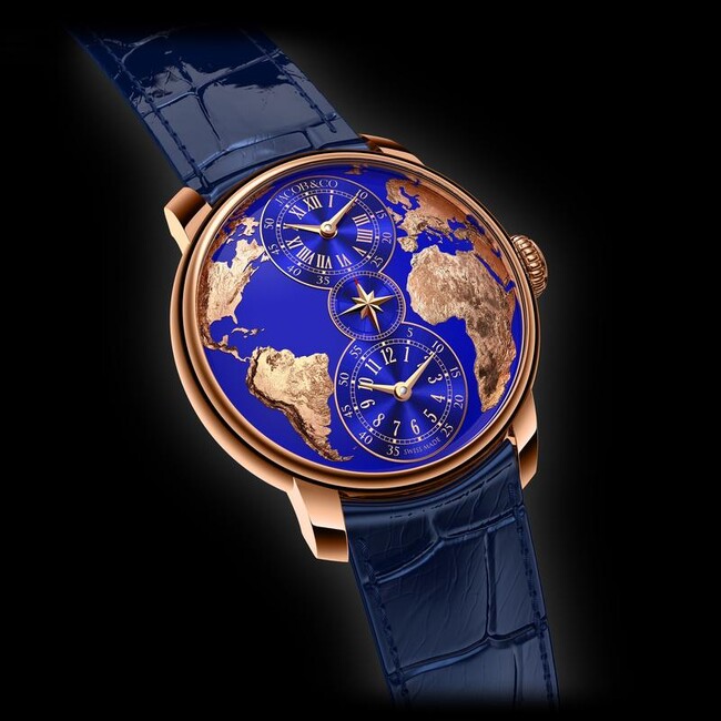 文字盤の世界地図はレーザー刻印により、ローズゴールド製の立体地形図となっている他、中心のスモールセコンド針がコンパスローズの形をしており、ポインターとして機能するよう北方表示の赤いチップでマーキングされています。