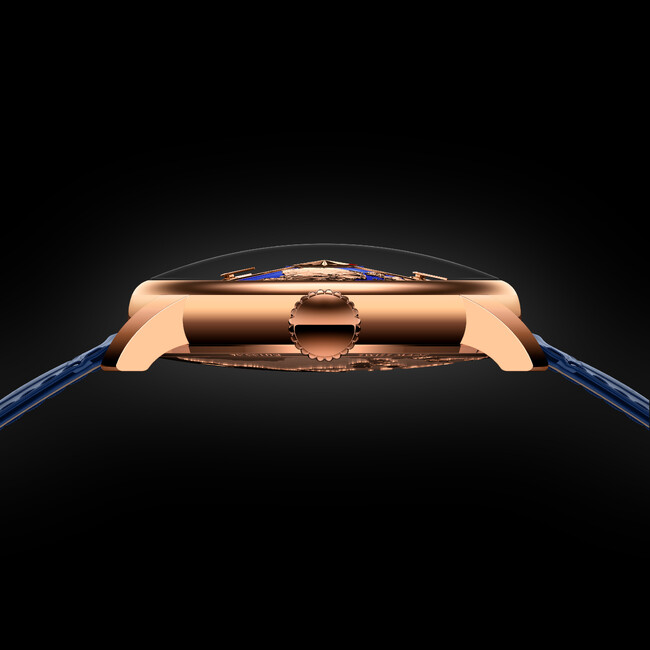 リューズは懐中時計にも見る趣き有るクラシカルなスタイルで、裏蓋にはローズゴールドの世界地図がレーザー刻印され、12時方向には「THE WORLD IS YOURS」のコレクション名を冠している他、その地図には、ジェイコブ&コーのロゴがウズベキスタンの位置に配置されており、創業者であるアラボ家のルーツを示しています。