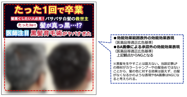 3.育毛に関する商材において、カラーシャンプーや白髪染めではないにもかかわらず白髪が減ることや黒髪だけを生やすなどの承認外の効能効果表現をしているもの。
