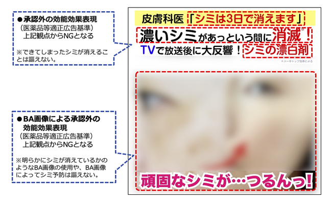1.しみやしわに関する商材において、承認を受けていないにもかかわらず、あたかもしみやしわが改善されるような効能効果表現をしているもの(Before After画像を用いた体験談風訴求含む)。
