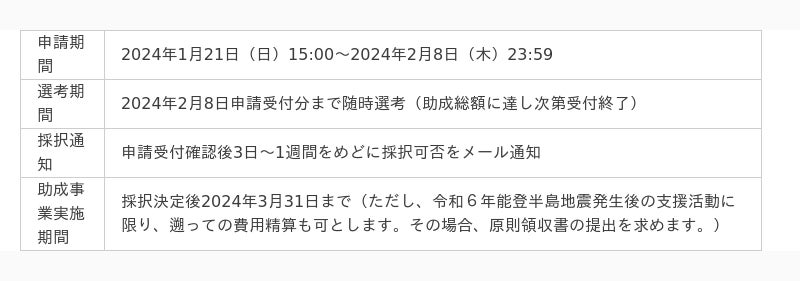 この基金では、石川県内での緊急・復旧・復興支援活動を助成プログラムで支援します。緊急期のみならず、復旧期・復興期まで中長期的な支援を行う予定です。2024年2月8日(木)まで公募を受け付け、随時選考を行います。※助成総額に達し次第、受付終了