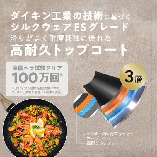 シリーズは、ダイキン工業の「シルクウェアESグレード」で滑りが良く耐摩耗性に優れた高耐久トップコートを採用しています。金属ヘラ試験クリアが100万回※の、こびりつきにくく汚れもスルッと落ちるコーティングとなっています。(※JIS S2010耐摩耗性試験に準じ、ダイキン工業株式会社にて試験を実施。)