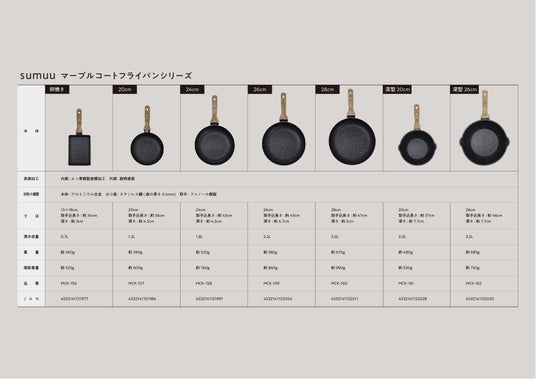 卵焼き、20cm、24cm、26cm、28cm、深型20cm、深型26cmの全7種。