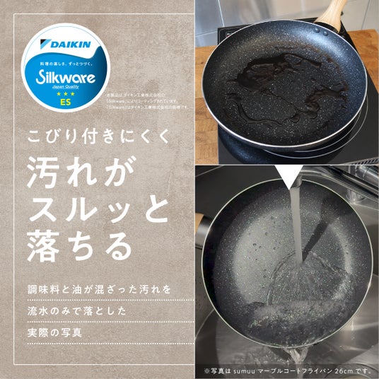 ダイキン工業の技術に基づく「シルクウェアESグレード」で、滑りがよく耐摩耗性に優れた高耐久トップコート。こびりつきにくく汚れもスルッと落ちるフライパンシリーズ。