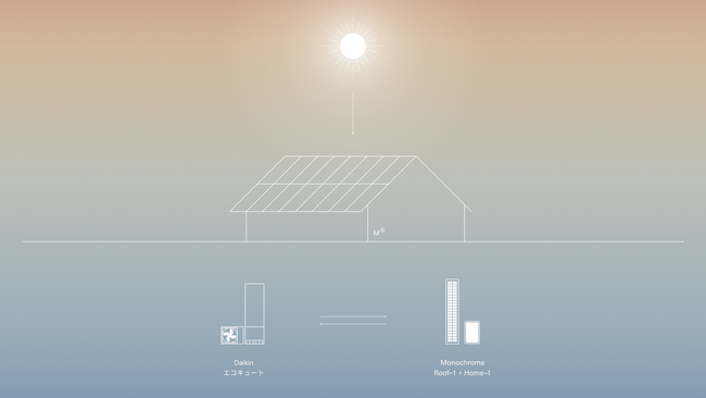 モノクロームは、未来の住宅のインフラとなるエネルギーシステムを開発するスタートアップ企業です。2023年にエネルギーをつくる屋根「Roof-1」と未来のHEMS「Home-1」の製品販売を開始しました。さらに、モノクロームは、ダイキンから第三者割当増資により資金調達を行い、ダイキンとともに、モノクロームが開発するエネルギーの発電システムおよびコントロールシステムと、ダイキンが開発する空調機器やヒートポンプ給湯機(以下「おひさまエコキュート」)の接続および制御の連携を進めています。