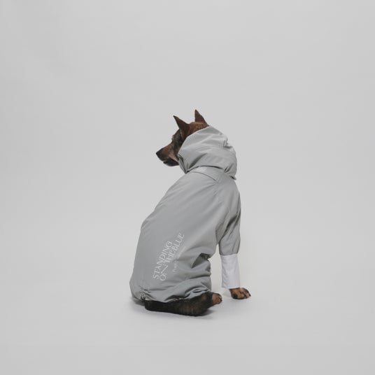 第一弾は、当ブランドでも人気の高いレインスーツです。コラボレーションカラーとしてグレーを発売し、保護犬をモデルに起用したルックも公開。本アイテムの利益の全額はピースウィンズ・ジャパンへ寄付いたします。