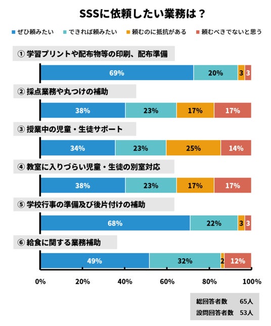 特に、依頼していい業務なのかが不明瞭であることから、依頼を躊躇するケースが多いようです。自由記述からは、スクールサポートスタッフのスキルに差があり、「依頼業務について説明することが難しい」「依頼した業務を自分でやり直すこともある」という意見もありました。また、普段の業務量の多さから「依頼する時間とエネルギーがない」という現状もあるようです。
