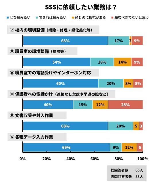 「給食に関する業務補助(81%)」「職員室での電話受けやインターホン対応(80%)」「教室に入りづらい児童・生徒の別室対応(61%)」「授業中の児童・生徒のサポート(57%)」「保護者への電話かけ(連絡なし欠席や早退の際など)(55%)」などの業務は、実際にはスクールサポートスタッフが担っているケースは2割ほどでしたが、「ぜひ頼みたい」「できれば頼みたい」と考えている教職員は回答者の半数以上にのぼりました。