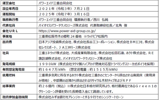 本事業は、バイオマスパワーテクノロジーズ株式会社(本社:三重県松阪市)が、2021年7月に設立したパワーエイド三重合同会社(本社:同県同市)が建設・運営する、完全NON-FIT型で組成する木材・製造業生産副産物ハイブリッド燃料による脱炭素電源を開発する事業です。
