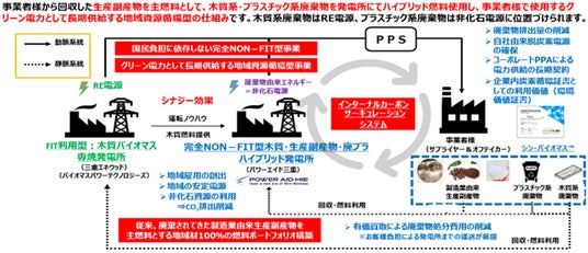 本事業は、事業者さまから回収した木質系生産副産物とプラスチック系資源(以下「RPF」)を発電所でハイブリッド燃料として使用し、事業者さまにグリーン電力として循環させる新たな仕組みであり、私たちはこれを【インターナルカーボンサーキュレーションシステム】と名付けております。このシステムは従来型の廃棄物を廃棄物として処理する方法ではなく、有価物すなわち製造業由来の生産副産物として買取り、エネルギー資源として利用するものです。私たちはこれを令和時代における新しい燃料コンセプト、【シン・バイオマス(R)】(商標登録取得)として定義いたしました。