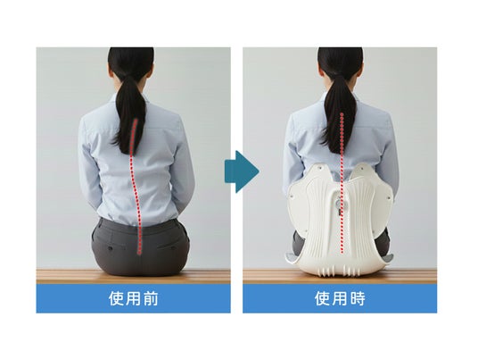 JAGOの最大の特徴は、上部に設置された「可動式背もたれ」です。座ったまま手を伸ばしたり、座り直したりする動作に合わせて背もたれがリアルタイムで追従。常に背骨のS字カーブにフィットし、優しくホールドし続けることで、無理のない理想的な姿勢を長時間サポートします。