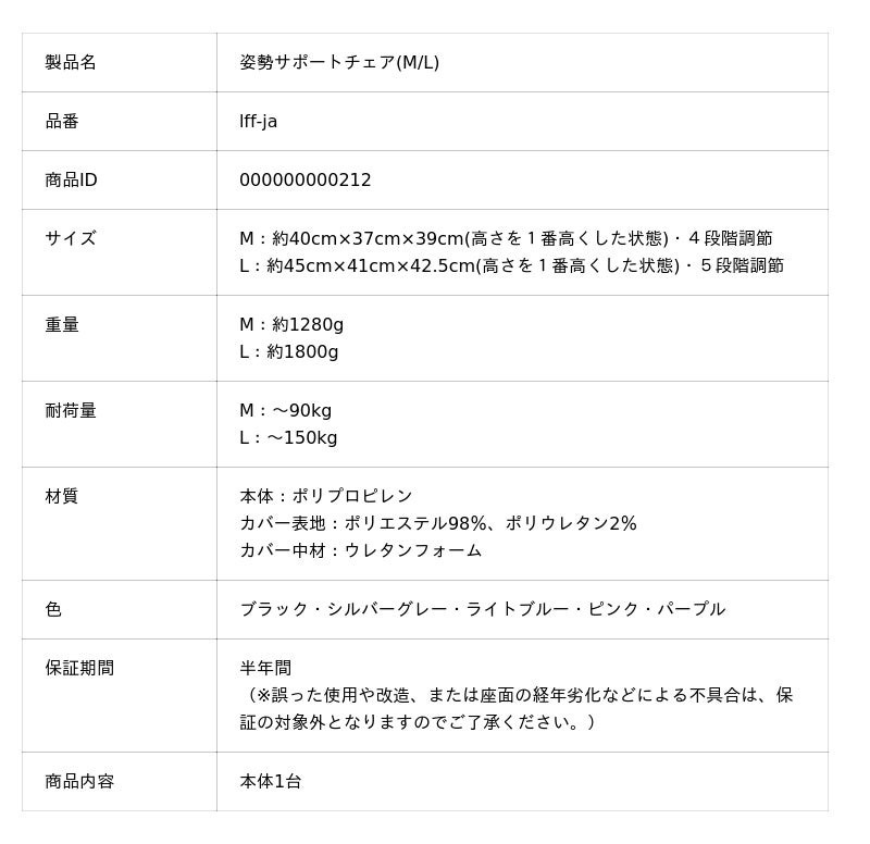 M・Lの2サイズ展開、高さ調整機能付き。お子様や小柄な女性から耐荷重150kgまで対応の大柄な男性まで、幅広い年代の「座り疲れ」にアプローチ。