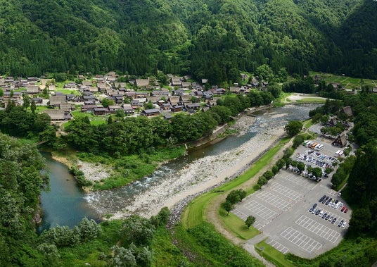 せせらぎ公園小呂駐車場(手前)と世界遺産 荻町合掌造り集落