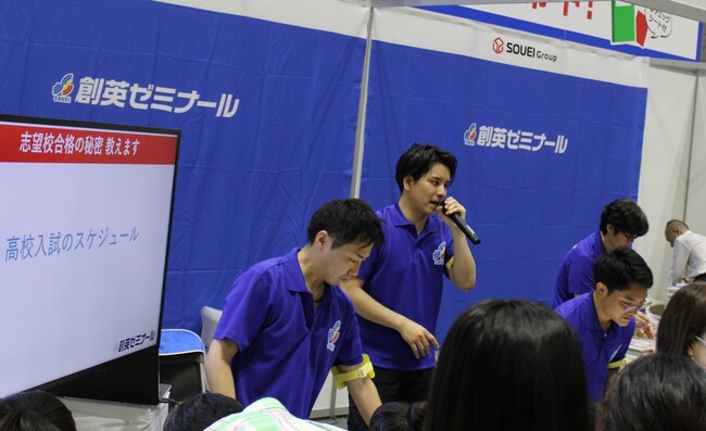 また、会場には学校紹介ブースのほかに休憩スペースや協賛ブースもあり、受験の疑問点だけではなく勉強方法や入学者選抜制度について聞ける場所をご用意しました。創英ゼミナールのブースにも受験の勉強法などで悩んでいる生徒にご来場いただきました。