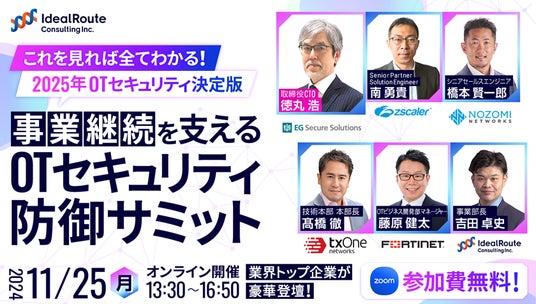 アイディルートコンサルティング株式会社(本社:東京都千代田区、代表取締役社⾧:松本 忠雄、以下:アイディルートコンサルティング) は、2024年11月25日に業界トップ4メーカとの共催により「OTセキュリティ防御サミット」をオンライン形式にて開催いたします。