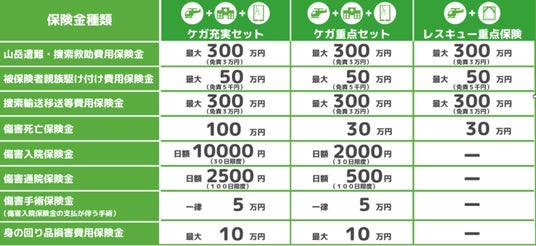 (1)『ワンタイムやまの保険』は、ロッククライミング等の趣味、山岳登攀(とうはん)、アイゼン等の道具、職業における制限を設けていない1日(日帰り)142円から契約ができる登山保険です。具体的な補償としては、警察が認定した遭難における捜索費用、遭難捜査時における親族の駆け付け費用、遭難者の重症時等の移送費用、ケガによって死亡した場合の保険金、入院した場合の保険金、通院した場合の保険金、手術した場合の保険金、そしてケガと共に携行品が壊れた場合の費用を支払うものです。