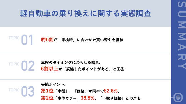 まず、約6割が車検のタイミングに合わせて車を買い替えた経験があり、その結果、思い通りの買い替えが実現せず、6割以上が「妥協したポイントがあった」と回答しました。具体的には、「車種」、「価格」、「車体カラー」などのスペックや価格で妥協することが多いことが分かりました。また、車を買い替えたタイミングの失敗について質問したところ、「車検直後に乗り換えが必要となり車検代がもったいなかった」や「安く購入できる時期を逃してしまった」などの回答が得られた他、「車検を通した直後に事故に遭い買い替えが必要になった」や「オリンピックナンバーが終わってしまった」などのエピソードも寄せられました。加えて、約8割の方が、「車検のタイミングに左右されることなく、自身の納得できるタイミングで車の乗り換えをしたい。」と回答しています。