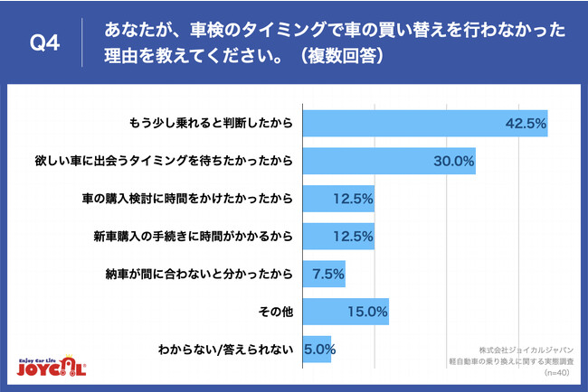 Q1で「いいえ」と回答した方に、「Q4.あなたが、車検のタイミングで車の買い替えを行わなかった理由を教えてください。(複数回答)」(n=40)と質問したところ、「もう少し乗れると判断したから」が42.5%、「欲しい車に出会うタイミングを待ちたかったから」が30.0%という回答となりました。