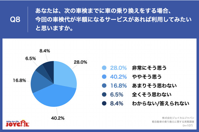 「Q8.あなたは、次の車検までに車の乗り換えをする場合、今回の車検代が半額になるサービスがあれば利用してみたいと思いますか。」(n=107)と質問したところ、「非常にそう思う」が28.0%、「ややそう思う」が40.2%という回答となりました。