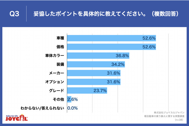 Q2で「いくつもある」「1つだけある」と回答した方に、「Q3.妥協したポイントを具体的に教えてください。(複数回答)」(n=38)と質問したところ、「車種」が52.6%、「価格」が52.6%、「車体カラー」が36.8%という回答となりました。