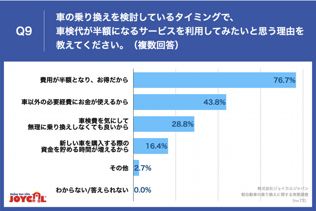 Q8で「非常にそう思う」「ややそう思う」と回答した方に、「Q9.車の乗り換えを検討しているタイミングで、車検代が半額になるサービスを利用してみたいと思う理由を教えてください。(複数回答)」(n=73)と質問したところ、「費用が半額となり、お得だから」が76.7%、「車以外の必要経費にお金が使えるから」が43.8%、「車検費を気にして無理に乗り換えしなくても良いから」が28.8%という回答となりました。